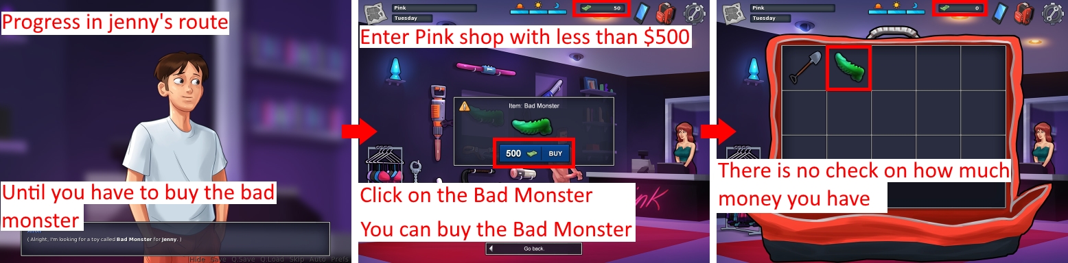 | Description | Version 0.18.2. See attachment. The first bug I report for this version, but not the last. Steps to reproduce: 1. Progress in Jenny's.route until the main character has to buy the Bad Monster. 2. Go to Pink shop with less than $500. 3. Click on the Bad Monster. Issue: • We can buy the Bad Monster wich cost $500 with less than $500. Solution: • We shouldn't be able to buy the Bad Monster with less than $500. | ||||