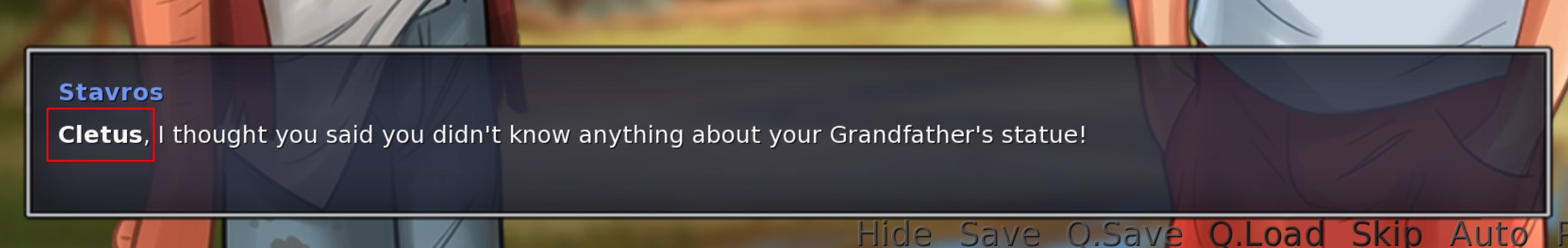It's a minor typo in the code, in characters\clyde\button_dialogues, line 140: if M_clyde.get("cletus"): player_name "{b}Clyde{/b}, I thought you said you didn't know anything about your Grandfather's statue!" else: player_name "{b}Cletus{/b}, I thought you said you didn't know anything about your Grandfather's statue!" --> if M_clyde.get("cletus"): player_name "{b}Cletus{/b}, I thought you said you didn't know anything about your grandfather's statue!" else: player_name "{b}Clyde{/b}, I thought you said you didn't know anything about your grandfather's statue!" |