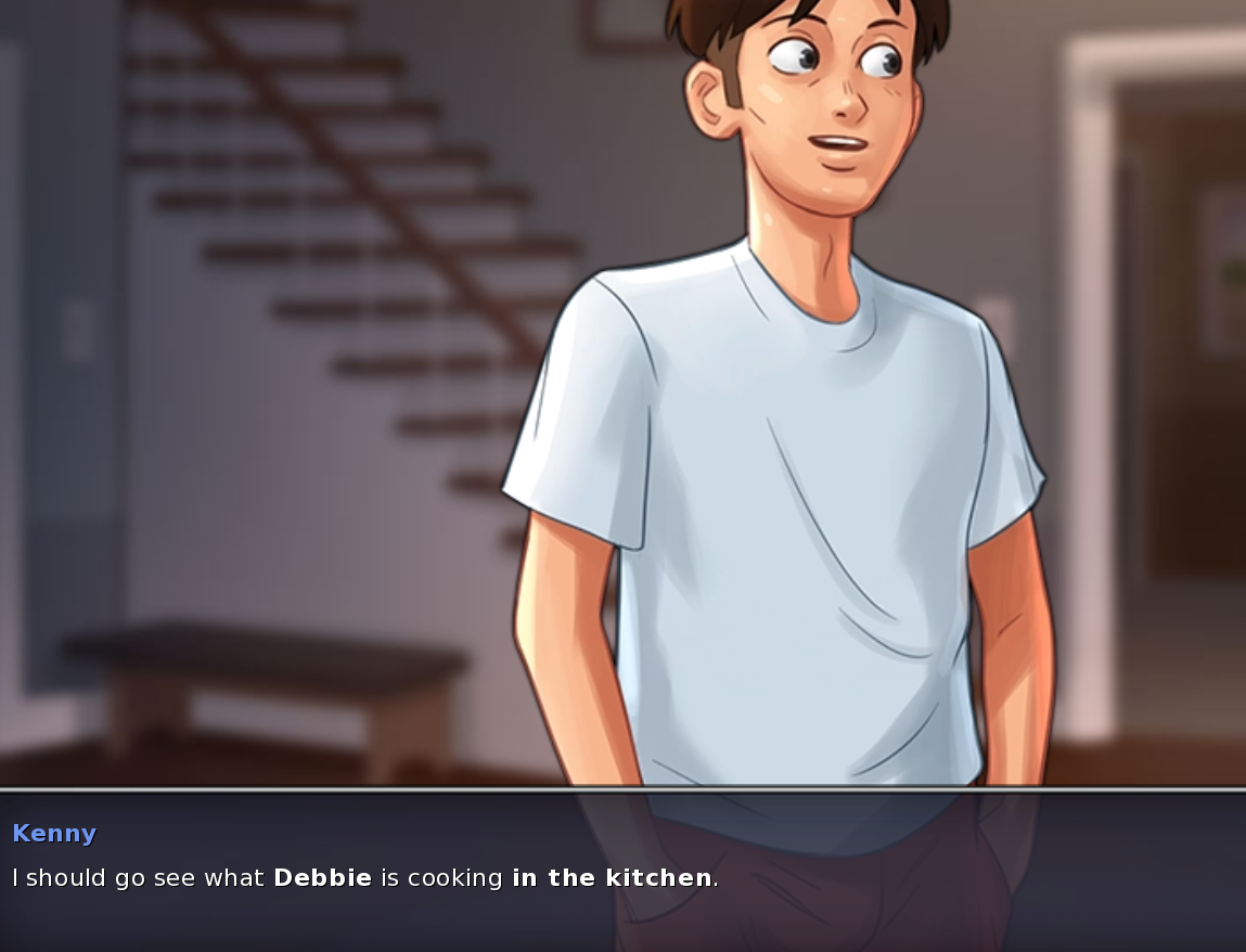 I was able to reproduce this bug. It can only occur if the player chooses to have sex with Debbie in the morning, the day after the threesome. The sex scene add one tick to the time of day. Debbie is not in the kitchen on the afternoon, but the message to meet her in the kitchen prevents the player to go upstairs or outside. Report confirmed and updated to version 0.19.5. No ETA for the bug correction. |