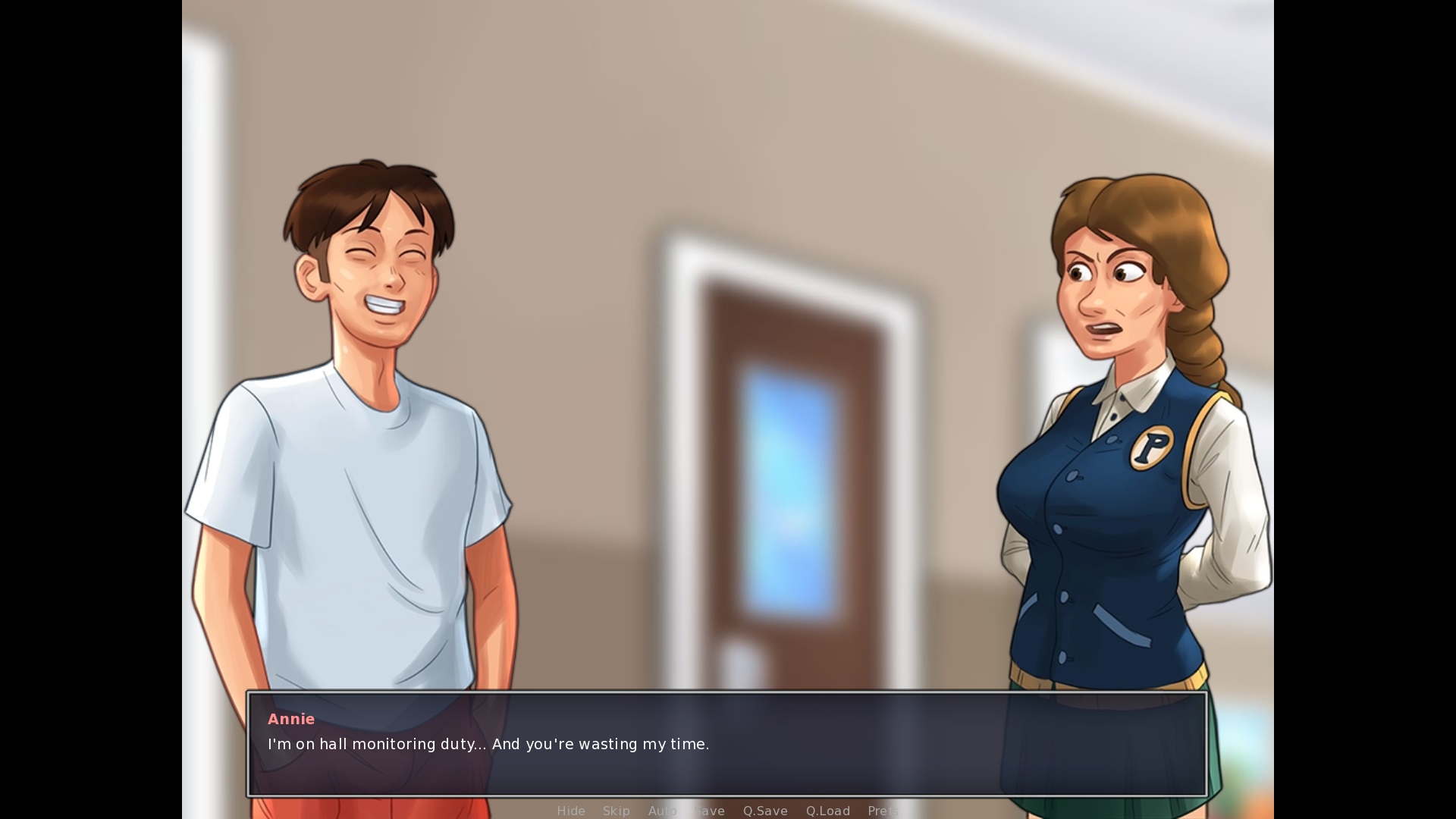 | Description | I tried to talk to Annie at her home in the evening, but the Cutscene switch to ther school dialog at lunch break. This problem exist for me since version: v.0.18 I attach the files the first on is how it was at version 0.17.5 the second one is how it still looks at version 0.18.6. | ||||
