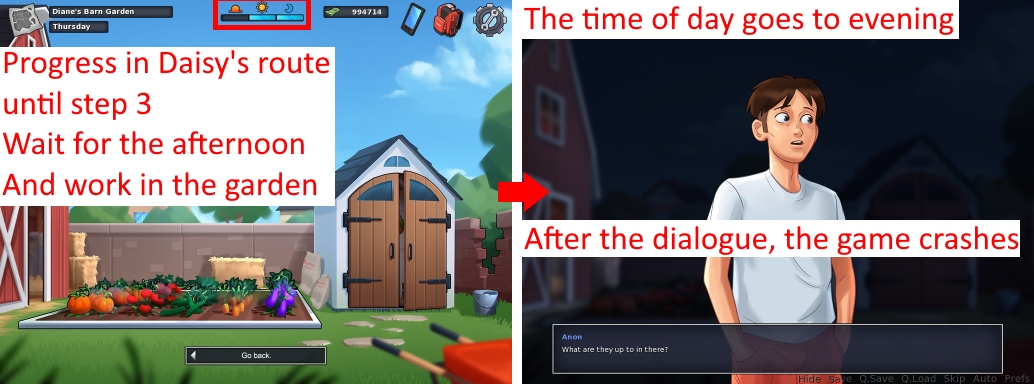 As the way to reproduce this bug is missing, I add it, and the attachment, and the save file! Steps to reproduce: 1. Progress in Daisy's route until step 3. 2. Wait for the afternoon. 3. Go to Diane's house and do the garden minigame. 4. The time of day goes to evening. Issue: • After the main character's initial dialogue, the game crashes. Solution: • After the main character's initial dialogue, the game shouldn' t crash. This bug report is related (but not duplicate of) to bug report 0001967 and bug report 0002033. The cause of these bugs is the same: Diane is not supposed to wear the "nightgown" outfit at night in the barn. It is therefore a more general problem that must be addressed by developers. Daisy milking bug.jpg (270,687 bytes) 1-1-LT1.save (750,225 bytes) |