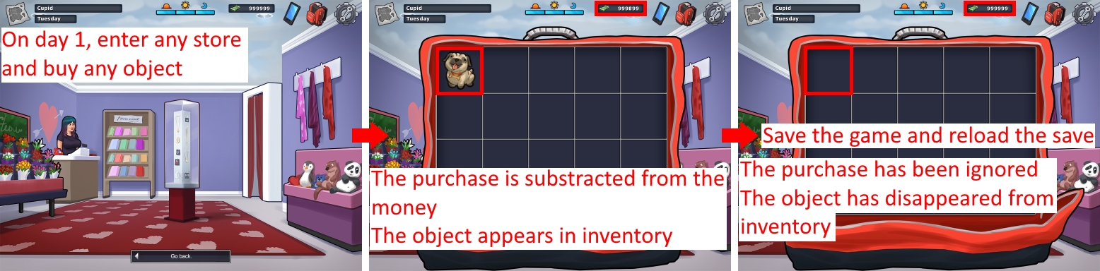 | Description | Version 0.18.6. See attachment. Save system is still under development, but for now it's not consistent, nor reliable as any save system should be. Currently, variables are saved when the next screen is loaded. This means that if we don't change the screen, they are simply ignored from the save. This is not how a save is supposed to work. It must be done immediately, without any additional steps. This is a major and general game issue. Steps to reproduce: 1. Enter any store. 2. Purchase any item. 3. The ipurchase is substracted from the money 4. Open your inventory, the item appears in it. 5. Save the game. 6. Reload the game. Issues: • The purchase has been ignored. • Open your inventory: the item has disappeared from inventory. Solutions: • The purchase should not disappeared. | ||||