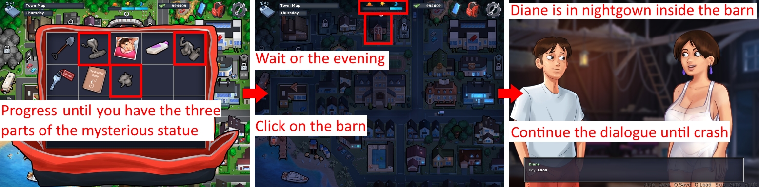The problem comes from the fact that several scenes with Diane automatically start when you click on the barn during the evening, even though Diane is supposed to be at home. I don't know what is the developers' intention because some scenes should not be available during the evening (the one where we give her The Breeder Guide or the statue, etc.), but others should always be available day and night (Daisy who gives birth). So I can't propose a solution except to refine the call to the dialogue labels. |