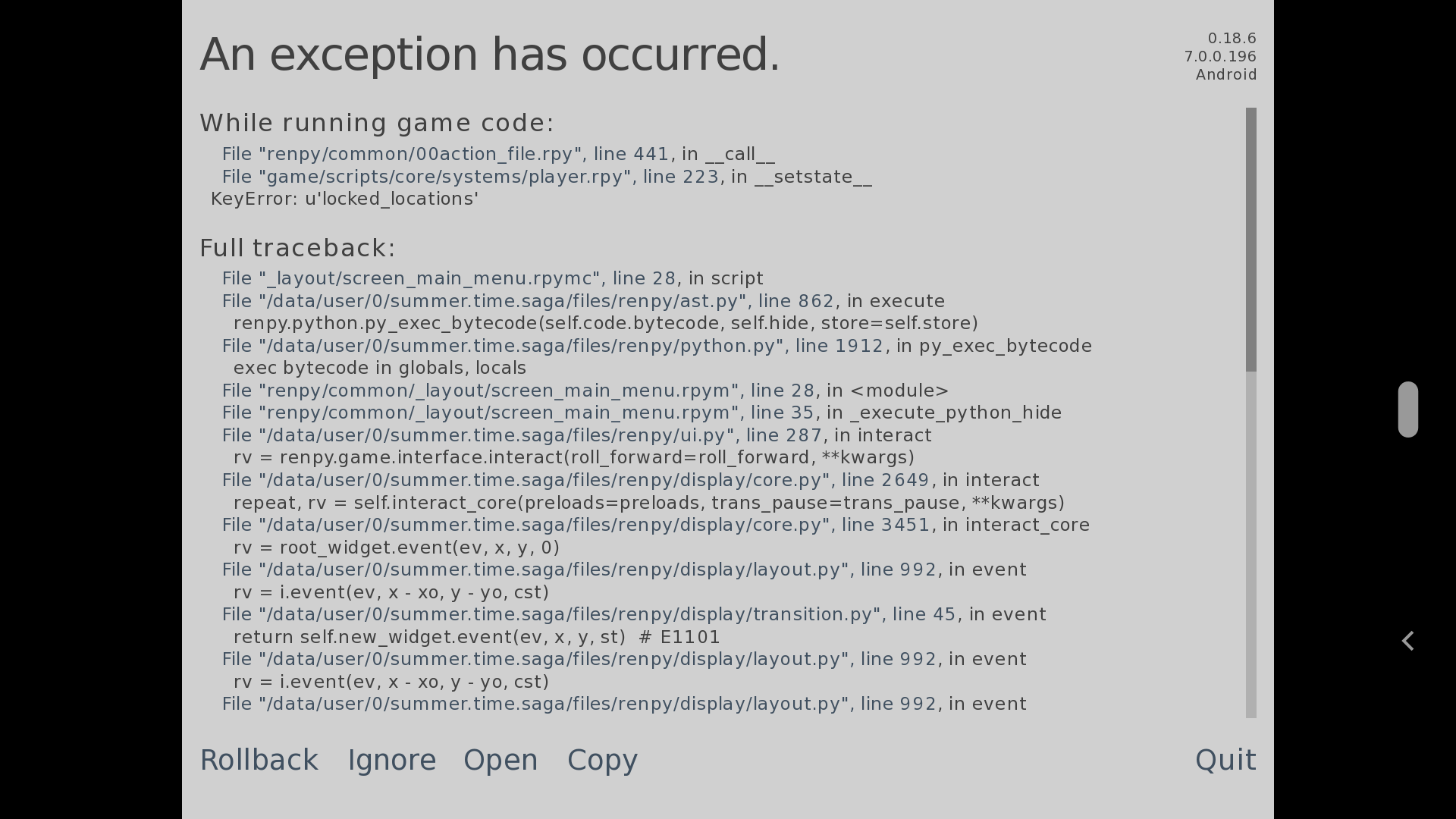 | Description | Good day App is crashing every time i load my save game since i update to 18.5. I updated the app to 18.6 but it still crashed when i load the save game. I haven't play the game for a while because of this. This is a error code [code] I'm sorry, but an uncaught exception occurred. While running game code: File "renpy/common/00action_file.rpy", line 441, in __call__ File "game/scripts/core/systems/player.rpy", line 223, in __setstate__ KeyError: u'locked_locations' -- Full Traceback ------------------------------------------------------------ Full traceback: File "_layout/screen_main_menu.rpymc", line 28, in script File "/data/user/0/summer.time.saga/files/renpy/ast.py", line 862, in execute renpy.python.py_exec_bytecode(self.code.bytecode, self.hide, store=self.store) File "/data/user/0/summer.time.saga/files/renpy/python.py", line 1912, in py_exec_bytecode exec bytecode in globals, locals File "renpy/common/_layout/screen_main_menu.rpym", line 28, in <module> File "renpy/common/_layout/screen_main_menu.rpym", line 35, in _execute_python_hide File "/data/user/0/summer.time.saga/files/renpy/ui.py", line 287, in interact rv = renpy.game.interface.interact(roll_forward=roll_forward, **kwargs) File "/data/user/0/summer.time.saga/files/renpy/display/core.py", line 2649, in interact repeat, rv = self.interact_core(preloads=preloads, trans_pause=trans_pause, **kwargs) File "/data/user/0/summer.time.saga/files/renpy/display/core.py", line 3451, in interact_core rv = root_widget.event(ev, x, y, 0) File "/data/user/0/summer.time.saga/files/renpy/display/layout.py", line 992, in event rv = i.event(ev, x - xo, y - yo, cst) File "/data/user/0/summer.time.saga/files/renpy/display/transition.py", line 45, in event return self.new_widget.event(ev, x, y, st) # E1101 File "/data/user/0/summer.time.saga/files/renpy/display/layout.py", line 992, in event rv = i.event(ev, x - xo, y - yo, cst) File "/data/user/0/summer.time.saga/files/renpy/display/layout.py", line 992, in event rv = i.event(ev, x - xo, y - yo, cst) File "/data/user/0/summer.time.saga/files/renpy/display/screen.py", line 697, in event rv = self.child.event(ev, x, y, st) File "/data/user/0/summer.time.saga/files/renpy/display/layout.py", line 992, in event rv = i.event(ev, x - xo, y - yo, cst) File "/data/user/0/summer.time.saga/files/renpy/display/layout.py", line 239, in event rv = d.event(ev, x - xo, y - yo, st) File "/data/user/0/summer.time.saga/files/renpy/display/layout.py", line 992, in event rv = i.event(ev, x - xo, y - yo, cst) File "/data/user/0/summer.time.saga/files/renpy/display/layout.py", line 239, in event rv = d.event(ev, x - xo, y - yo, st) File "/data/user/0/summer.time.saga/files/renpy/display/layout.py", line 992, in event rv = i.event(ev, x - xo, y - yo, cst) File "/data/user/0/summer.time.saga/files/renpy/display/layout.py", line 239, in event rv = d.event(ev, x - xo, y - yo, st) File "/data/user/0/summer.time.saga/files/renpy/display/behavior.py", line 906, in event return handle_click(self.clicked) File "/data/user/0/summer.time.saga/files/renpy/display/behavior.py", line 841, in handle_click rv = run(action) File "/data/user/0/summer.time.saga/files/renpy/display/behavior.py", line 315, in run return action(*args, **kwargs) File "renpy/common/00action_file.rpy", line 441, in __call__ File "/data/user/0/summer.time.saga/files/renpy/loadsave.py", line 727, in load roots, log = loads(location.load(filename)) File "/data/user/0/summer.time.saga/files/renpy/loadsave.py", line 62, in loads return pickle.loads(s) File "/data/user/0/summer.time.saga/files/lib/python2.7/pickle.py", line 1382, in loads return Unpickler(file).load() File "/data/user/0/summer.time.saga/files/lib/python2.7/pickle.py", line 858, in load dispatch[key](self) File "/data/user/0/summer.time.saga/files/lib/python2.7/pickle.py", line 1217, in load_build setstate(state) File "game/scripts/core/systems/player.rpy", line 223, in __setstate__ KeyError: u'locked_locations' [/code] | ||||