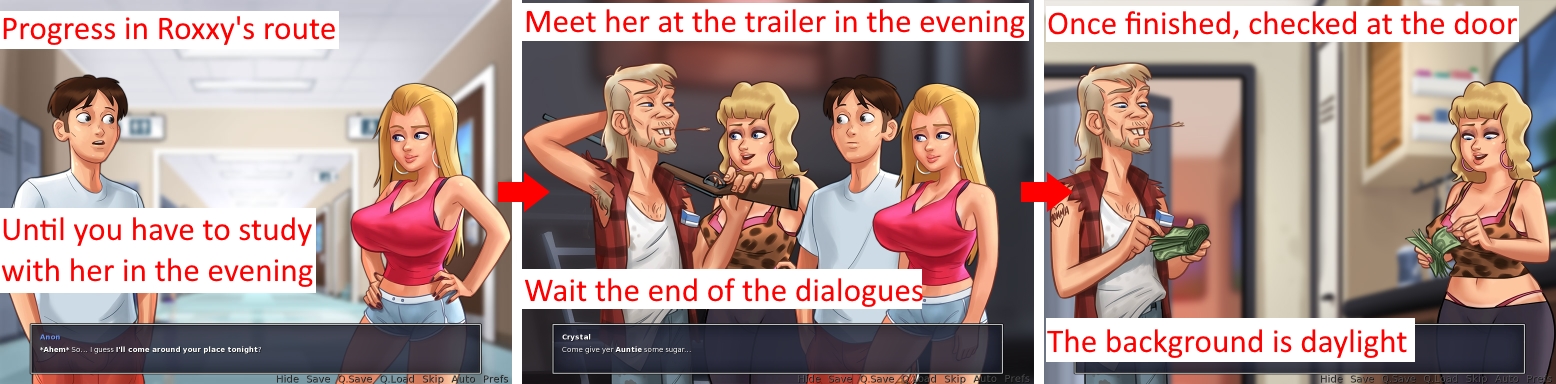 1. Progress in Roxxy's route until she asks the main character to meet her in the evening at the trailer