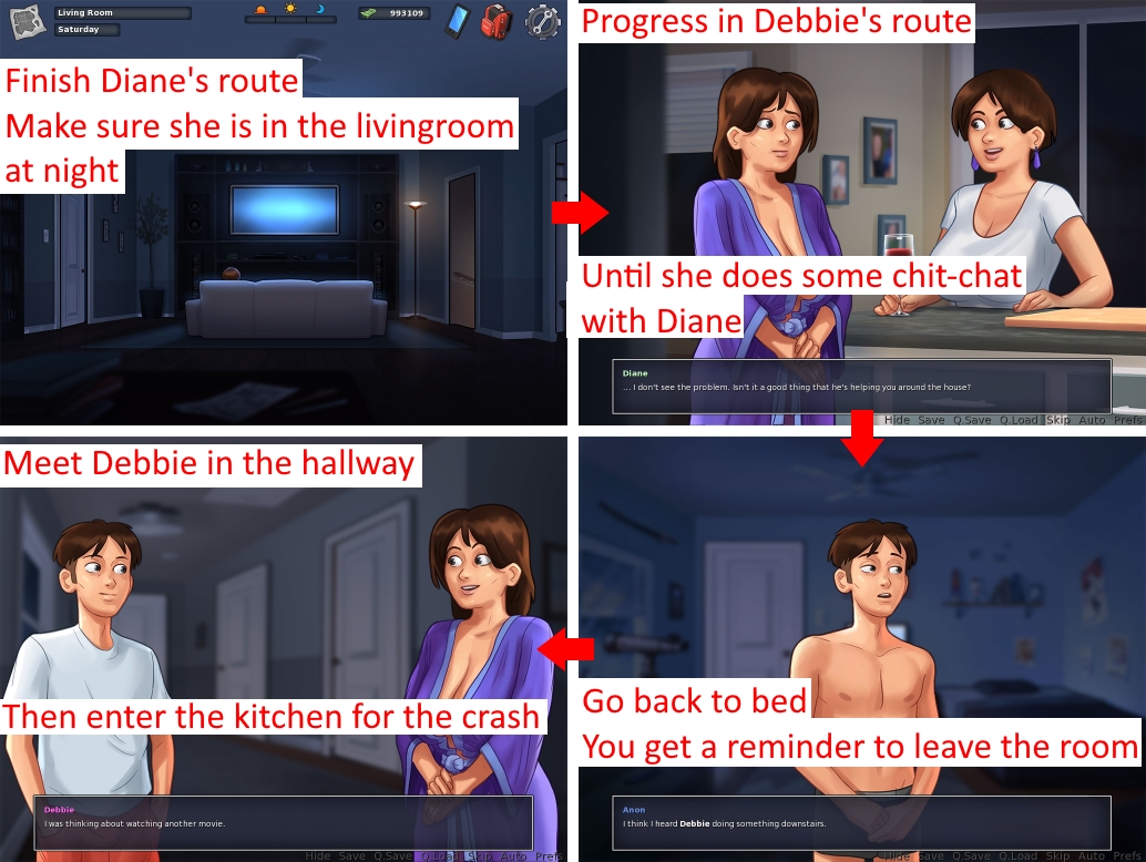 | Description | Version 0.18.6. See attachments. Steps to reproduce: 1. Complete Diane's route. 2. Make sure she is in the living room at night. 3. Progress in Debbie's route until she has some chit-chat with Diane. 4. Return in the bed, try to sleep. 5. You get a reminder to leave the main character's bedroom. 6. Go in the hallway where you meet Debbie. 7. Instead of the livingroom, enter the kitchen. Issue: • The game crashes. Solution: • The game shouldn't crash. | ||||