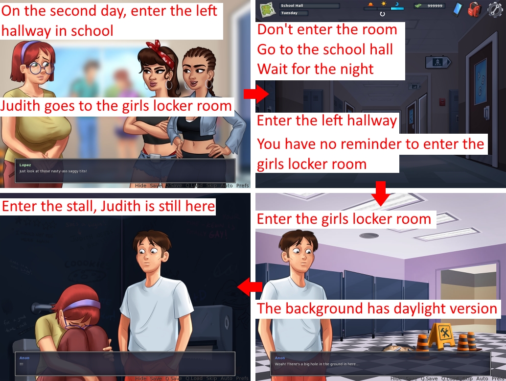 | Description | Version 0.18.6. See attachments. Steps to reproduce: 1. Begin a new game and progress until the second day. 2. Witness Judith and the Latinas in the school left hallway. 3. Don't enter the room and go to the school hall. 4. Return to the left hallway: you hear sound coming from the girls locker room. 5. Wait for the evening/night. 6. Enter the left hallway again. 7. You don't hear sound coming from the girls locker room. 8. Enter the girls locker room. Issues: • The background changes to the day version. • Enter the stall, Judith is here. • The complete scene is played at night. Solutions: • The background should not change to the day version. • Roxxy, Becca and Missy shouldn't be in the girls locker room at night. • The scene shouldn't be played at night. | ||||