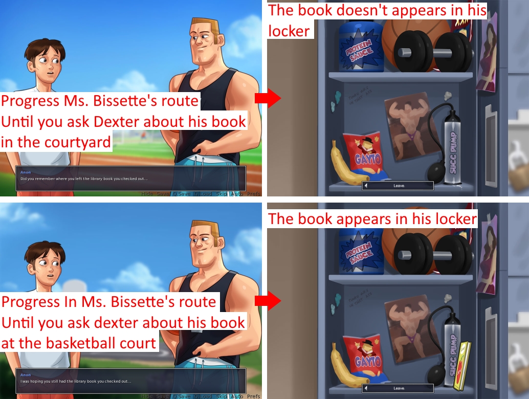 | Description | Version 0.18.6. See attachment. As for now, Dexter's book only appears in his locker only if we talk to him in the afternoon at the courtyard. If we talk to him about it in the morning in the courtyard, his locker stays empty. This is not the intended behaviour, because in both versions the main character says "He could be lying. I should check his locker!". From this moment the book should be in his locker. | ||||