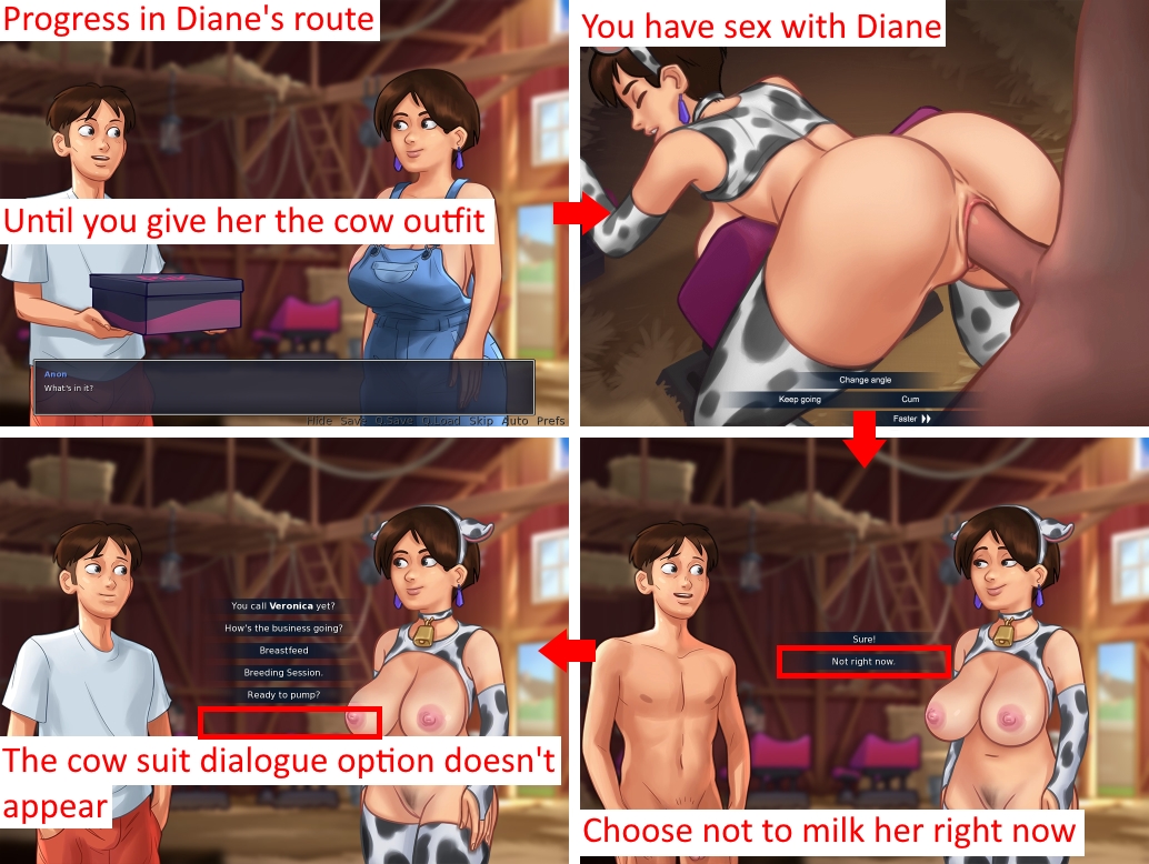 | Description | Version 0.18.6. See attachments. Steps to reproduce: 1. Progress in Diane's route until you give her the cow outfit from Pink shop. 2. Play the impregnation minigame (succeed or fail it doesn't change anything) 3. Choose not to milk her (option dialogue "Not right now"). 4. Talk to her again. Issue: • The cow suit option dialogue doesn't appear. Solution: • The cow suit option dialogue should appear after the first impregnation minigame. -------------------------------------------------------------------------------------- Steps to reproduce after the first part above: 5. Talk to Diane again. 6. Choose to milk her (option dialogue "Ready to pump") 7. Confirm by clicking on "Sure!" 8. Play the milking minigame. 9. Talk to her again. Issue: • The cow suit option dialogue appears. Solution: • The cow suit option dialogue shouldn't appear after the milking minigame. | ||||