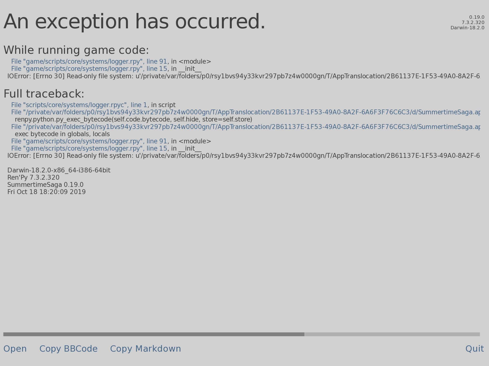 | Description | Unable to run game after installation; Tried to redownload over 10 times. TEXT IS: I'm sorry, but an uncaught exception occurred. While running game code: File "game/scripts/core/systems/logger.rpy", line 91, in <module> File "game/scripts/core/systems/logger.rpy", line 15, in __init__ IOError: [Errno 30] Read-only file system: u'/private/var/folders/p0/rsy1bvs94y33kvr297pb7z4w0000gn/T/AppTranslocation/2B61137E-1F53-49A0-8A2F-6A6F3F76C6C3/d/SummertimeSaga.app/Contents/Resources/autorun/summertime-saga.log' -- Full Traceback ------------------------------------------------------------ Full traceback: File "scripts/core/systems/logger.rpyc", line 1, in script File "/private/var/folders/p0/rsy1bvs94y33kvr297pb7z4w0000gn/T/AppTranslocation/2B61137E-1F53-49A0-8A2F-6A6F3F76C6C3/d/SummertimeSaga.app/Contents/Resources/autorun/renpy/ast.py", line 912, in execute renpy.python.py_exec_bytecode(self.code.bytecode, self.hide, store=self.store) File "/private/var/folders/p0/rsy1bvs94y33kvr297pb7z4w0000gn/T/AppTranslocation/2B61137E-1F53-49A0-8A2F-6A6F3F76C6C3/d/SummertimeSaga.app/Contents/Resources/autorun/renpy/python.py", line 2004, in py_exec_bytecode exec bytecode in globals, locals File "game/scripts/core/systems/logger.rpy", line 91, in <module> File "game/scripts/core/systems/logger.rpy", line 15, in __init__ IOError: [Errno 30] Read-only file system: u'/private/var/folders/p0/rsy1bvs94y33kvr297pb7z4w0000gn/T/AppTranslocation/2B61137E-1F53-49A0-8A2F-6A6F3F76C6C3/d/SummertimeSaga.app/Contents/Resources/autorun/summertime-saga.log' Darwin-18.2.0-x86_64-i386-64bit Ren'Py 7.3.2.320 SummertimeSaga 0.19.0 Fri Oct 18 18:20:09 2019 ``` | ||||