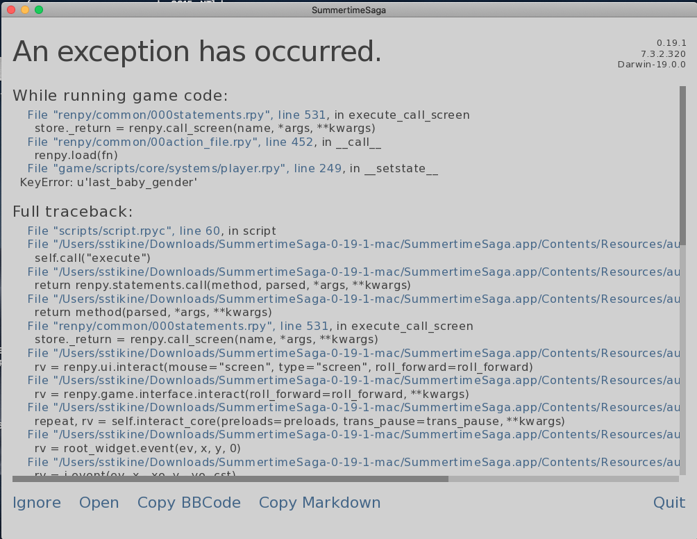 | Description | CTD when I try to load saved game from 18.1.x I'm sorry, but an uncaught exception occurred. While running game code: File "renpy/common/000statements.rpy", line 531, in execute_call_screen store._return = renpy.call_screen(name, *args, **kwargs) File "renpy/common/00action_file.rpy", line 452, in __call__ renpy.load(fn) File "game/scripts/core/systems/player.rpy", line 249, in __setstate__ KeyError: u'last_baby_gender' -- Full Traceback ------------------------------------------------------------ Full traceback: File "scripts/script.rpyc", line 60, in script File "/Users/sstikine/Downloads/SummertimeSaga-0-19-1-mac/SummertimeSaga.app/Contents/Resources/autorun/renpy/ast.py", line 1947, in execute self.call("execute") File "/Users/sstikine/Downloads/SummertimeSaga-0-19-1-mac/SummertimeSaga.app/Contents/Resources/autorun/renpy/ast.py", line 1935, in call return renpy.statements.call(method, parsed, *args, **kwargs) File "/Users/sstikine/Downloads/SummertimeSaga-0-19-1-mac/SummertimeSaga.app/Contents/Resources/autorun/renpy/statements.py", line 277, in call return method(parsed, *args, **kwargs) File "renpy/common/000statements.rpy", line 531, in execute_call_screen store._return = renpy.call_screen(name, *args, **kwargs) File "/Users/sstikine/Downloads/SummertimeSaga-0-19-1-mac/SummertimeSaga.app/Contents/Resources/autorun/renpy/exports.py", line 2896, in call_screen rv = renpy.ui.interact(mouse="screen", type="screen", roll_forward=roll_forward) File "/Users/sstikine/Downloads/SummertimeSaga-0-19-1-mac/SummertimeSaga.app/Contents/Resources/autorun/renpy/ui.py", line 295, in interact rv = renpy.game.interface.interact(roll_forward=roll_forward, **kwargs) File "/Users/sstikine/Downloads/SummertimeSaga-0-19-1-mac/SummertimeSaga.app/Contents/Resources/autorun/renpy/display/core.py", line 2699, in interact repeat, rv = self.interact_core(preloads=preloads, trans_pause=trans_pause, **kwargs) File "/Users/sstikine/Downloads/SummertimeSaga-0-19-1-mac/SummertimeSaga.app/Contents/Resources/autorun/renpy/display/core.py", line 3510, in interact_core rv = root_widget.event(ev, x, y, 0) File "/Users/sstikine/Downloads/SummertimeSaga-0-19-1-mac/SummertimeSaga.app/Contents/Resources/autorun/renpy/display/layout.py", line 998, in event rv = i.event(ev, x - xo, y - yo, cst) File "/Users/sstikine/Downloads/SummertimeSaga-0-19-1-mac/SummertimeSaga.app/Contents/Resources/autorun/renpy/display/layout.py", line 998, in event rv = i.event(ev, x - xo, y - yo, cst) File "/Users/sstikine/Downloads/SummertimeSaga-0-19-1-mac/SummertimeSaga.app/Contents/Resources/autorun/renpy/display/layout.py", line 998, in event rv = i.event(ev, x - xo, y - yo, cst) File "/Users/sstikine/Downloads/SummertimeSaga-0-19-1-mac/SummertimeSaga.app/Contents/Resources/autorun/renpy/display/screen.py", line 707, in event rv = self.child.event(ev, x, y, st) File "/Users/sstikine/Downloads/SummertimeSaga-0-19-1-mac/SummertimeSaga.app/Contents/Resources/autorun/renpy/display/layout.py", line 998, in event rv = i.event(ev, x - xo, y - yo, cst) File "/Users/sstikine/Downloads/SummertimeSaga-0-19-1-mac/SummertimeSaga.app/Contents/Resources/autorun/renpy/display/layout.py", line 244, in event rv = d.event(ev, x - xo, y - yo, st) File "/Users/sstikine/Downloads/SummertimeSaga-0-19-1-mac/SummertimeSaga.app/Contents/Resources/autorun/renpy/display/layout.py", line 998, in event rv = i.event(ev, x - xo, y - yo, cst) File "/Users/sstikine/Downloads/SummertimeSaga-0-19-1-mac/SummertimeSaga.app/Contents/Resources/autorun/renpy/display/layout.py", line 244, in event rv = d.event(ev, x - xo, y - yo, st) File "/Users/sstikine/Downloads/SummertimeSaga-0-19-1-mac/SummertimeSaga.app/Contents/Resources/autorun/renpy/display/layout.py", line 998, in event rv = i.event(ev, x - xo, y - yo, cst) File "/Users/sstikine/Downloads/SummertimeSaga-0-19-1-mac/SummertimeSaga.app/Contents/Resources/autorun/renpy/display/layout.py", line 244, in event rv = d.event(ev, x - xo, y - yo, st) File "/Users/sstikine/Downloads/SummertimeSaga-0-19-1-mac/SummertimeSaga.app/Contents/Resources/autorun/renpy/display/behavior.py", line 946, in event return handle_click(self.clicked) File "/Users/sstikine/Downloads/SummertimeSaga-0-19-1-mac/SummertimeSaga.app/Contents/Resources/autorun/renpy/display/behavior.py", line 881, in handle_click rv = run(action) File "/Users/sstikine/Downloads/SummertimeSaga-0-19-1-mac/SummertimeSaga.app/Contents/Resources/autorun/renpy/display/behavior.py", line 320, in run return action(*args, **kwargs) File "renpy/common/00action_file.rpy", line 452, in __call__ renpy.load(fn) File "/Users/sstikine/Downloads/SummertimeSaga-0-19-1-mac/SummertimeSaga.app/Contents/Resources/autorun/renpy/loadsave.py", line 760, in load roots, log = loads(location.load(filename)) File "/Users/sstikine/Downloads/SummertimeSaga-0-19-1-mac/SummertimeSaga.app/Contents/Resources/autorun/renpy/loadsave.py", line 65, in loads return pickle.loads(s) File "/home/tom/ab/x64lucid-deps/install/lib/python2.7/pickle.py", line 1382, in loads File "/home/tom/ab/x64lucid-deps/install/lib/python2.7/pickle.py", line 858, in load File "/home/tom/ab/x64lucid-deps/install/lib/python2.7/pickle.py", line 1217, in load_build File "game/scripts/core/systems/player.rpy", line 249, in __setstate__ KeyError: u'last_baby_gender' Darwin-19.0.0-x86_64-i386-64bit Ren'Py 7.3.2.320 SummertimeSaga 0.19.1 Sat Oct 19 07:18:28 2019 | ||||
