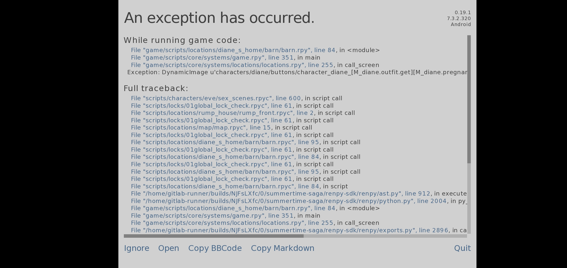| Description | ``` I'm sorry, but an uncaught exception occurred. While running game code: File "game/scripts/locations/diane_s_home/barn/barn.rpy", line 84, in <module> File "game/scripts/core/systems/game.rpy", line 351, in main File "game/scripts/core/systems/locations/locations.rpy", line 255, in call_screen Exception: DynamicImage u'characters/diane/buttons/character_diane_[M_diane.outfit.get][M_diane.pregnancy.to_string].png': could not find image. (u'characters/diane/buttons/character_diane_dressed.png') -- Full Traceback ------------------------------------------------------------ Full traceback: File "scripts/characters/eve/sex_scenes.rpyc", line 600, in script call File "scripts/locks/01global_lock_check.rpyc", line 61, in script call File "scripts/locations/rump_house/rump_front.rpyc", line 2, in script call File "scripts/locks/01global_lock_check.rpyc", line 61, in script call File "scripts/locations/map/map.rpyc", line 15, in script call File "scripts/locks/01global_lock_check.rpyc", line 61, in script call File "scripts/locations/diane_s_home/barn/barn.rpyc", line 95, in script call File "scripts/locks/01global_lock_check.rpyc", line 61, in script call File "scripts/locations/diane_s_home/barn/barn.rpyc", line 84, in script call File "scripts/locks/01global_lock_check.rpyc", line 61, in script call File "scripts/locations/diane_s_home/barn/barn.rpyc", line 95, in script call File "scripts/locks/01global_lock_check.rpyc", line 61, in script call File "scripts/locations/diane_s_home/barn/barn.rpyc", line 84, in script File "/home/gitlab-runner/builds/NJFsLXfc/0/summertime-saga/renpy-sdk/renpy/ast.py", line 912, in execute File "/home/gitlab-runner/builds/NJFsLXfc/0/summertime-saga/renpy-sdk/renpy/python.py", line 2004, in py_exec_bytecode File "game/scripts/locations/diane_s_home/barn/barn.rpy", line 84, in <module> File "game/scripts/core/systems/game.rpy", line 351, in main File "game/scripts/core/systems/locations/locations.rpy", line 255, in call_screen File "/home/gitlab-runner/builds/NJFsLXfc/0/summertime-saga/renpy-sdk/renpy/exports.py", line 2896, in call_screen File "/home/gitlab-runner/builds/NJFsLXfc/0/summertime-saga/renpy-sdk/renpy/ui.py", line 295, in interact File "/home/gitlab-runner/builds/NJFsLXfc/0/summertime-saga/renpy-sdk/renpy/display/core.py", line 2699, in interact File "/home/gitlab-runner/builds/NJFsLXfc/0/summertime-saga/renpy-sdk/renpy/display/core.py", line 3091, in interact_core File "/home/gitlab-runner/builds/NJFsLXfc/0/summertime-saga/renpy-sdk/renpy/display/core.py", line 541, in visit_all File "/home/gitlab-runner/builds/NJFsLXfc/0/summertime-saga/renpy-sdk/renpy/display/core.py", line 541, in visit_all File "/home/gitlab-runner/builds/NJFsLXfc/0/summertime-saga/renpy-sdk/renpy/display/core.py", line 541, in visit_all File "/home/gitlab-runner/builds/NJFsLXfc/0/summertime-saga/renpy-sdk/renpy/display/screen.py", line 434, in visit_all File "/home/gitlab-runner/builds/NJFsLXfc/0/summertime-saga/renpy-sdk/renpy/display/core.py", line 541, in visit_all File "/home/gitlab-runner/builds/NJFsLXfc/0/summertime-saga/renpy-sdk/renpy/display/core.py", line 541, in visit_all File "/home/gitlab-runner/builds/NJFsLXfc/0/summertime-saga/renpy-sdk/renpy/display/core.py", line 531, in visit_all File "/home/gitlab-runner/builds/NJFsLXfc/0/summertime-saga/renpy-sdk/renpy/display/image.py", line 730, in visit File "/home/gitlab-runner/builds/NJFsLXfc/0/summertime-saga/renpy-sdk/renpy/display/image.py", line 640, in find_target Exception: DynamicImage u'characters/diane/buttons/character_diane_[M_diane.outfit.get][M_diane.pregnancy.to_string].png': could not find image. (u'characters/diane/buttons/character_diane_dressed.png') ``` | ||||