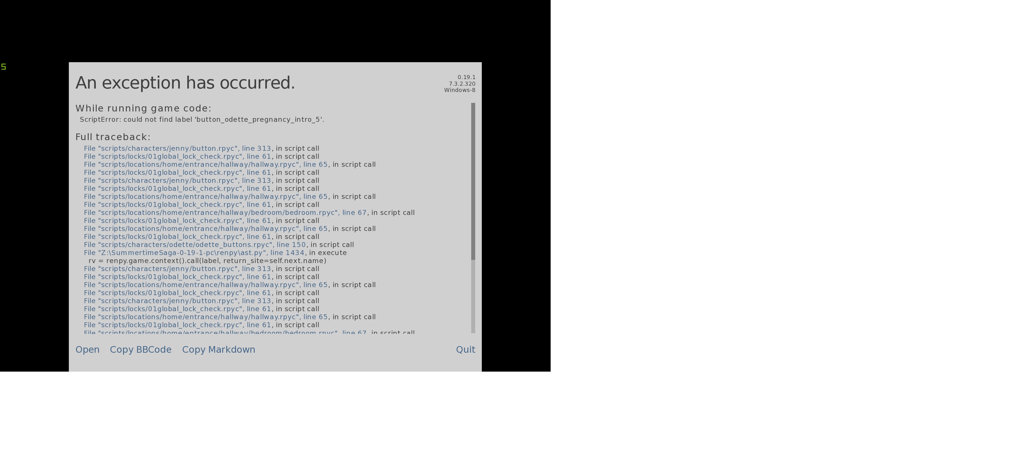 | Description | When odette has the second child birth and she's at the garage holding the baby and when you try to interact with Odette then game crashes without possibility to ignore. | ||||