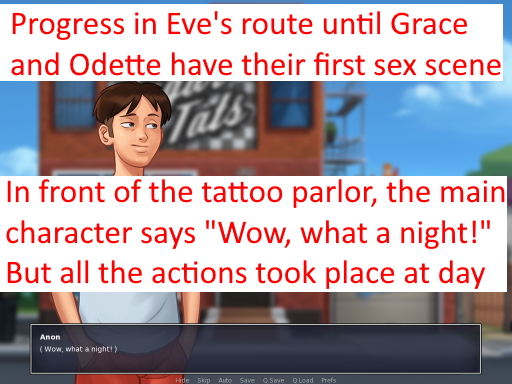 | Description | as described - the previous scene with Eve on the 2nd floor happens at night and our MC is heading home at "late night", so the scene in front of the tattoo parlor should be at night too. | ||||