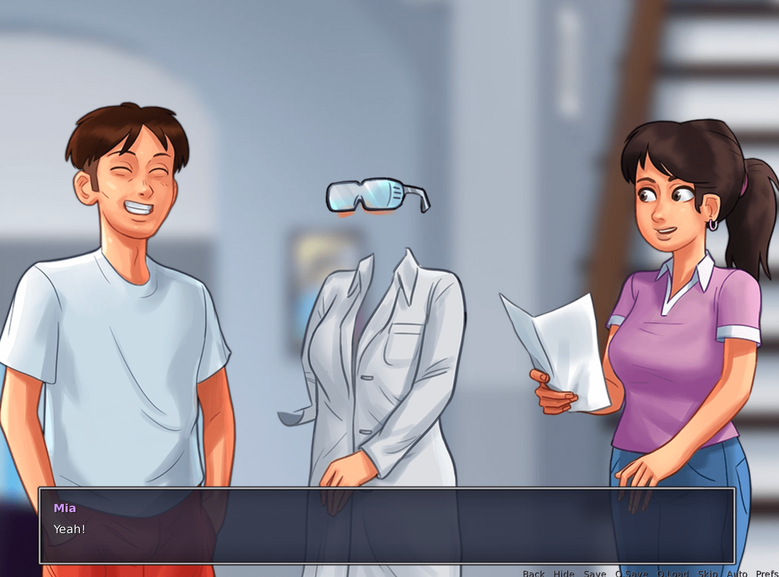 DescriptionTalking to Mia in the evening about getting a tattoo seems to trigger a disembodied lab coat and goggles floating between her and MC.