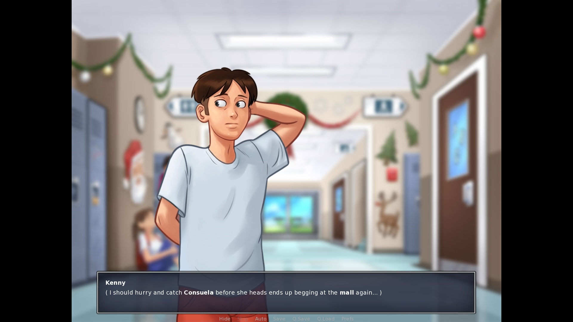 In the Beachhouse after getting the blowjob of Consuela: "( I wonder why is she so hell bent on hooking us up? )" "is" and "she" should be flipped to fix the word order "I wonder why she is so..." Talking with Consuela in the beachouse: the option "Maid Outfit" should have a lower case O for outfit The other two after that need interpunction (as most other choices of the game with one word have) When walking in on Consuela when she' cleaning the kitchen floor: None of the three options have interpunction. And the third option needs the space to be removed so it becomes "Nevermind" to be consistant in the game |