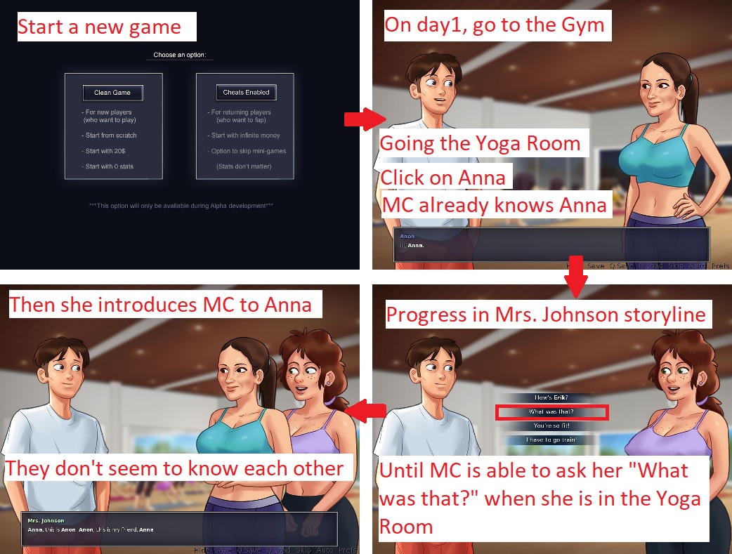 Anna introduction has be redone in versions 0.19.0 and 0.19.5, and the character can now only be met after the main character has talked to Mrs. Johnson first (gym or yoga quest). The issue has been fixed and the report is now closed. |