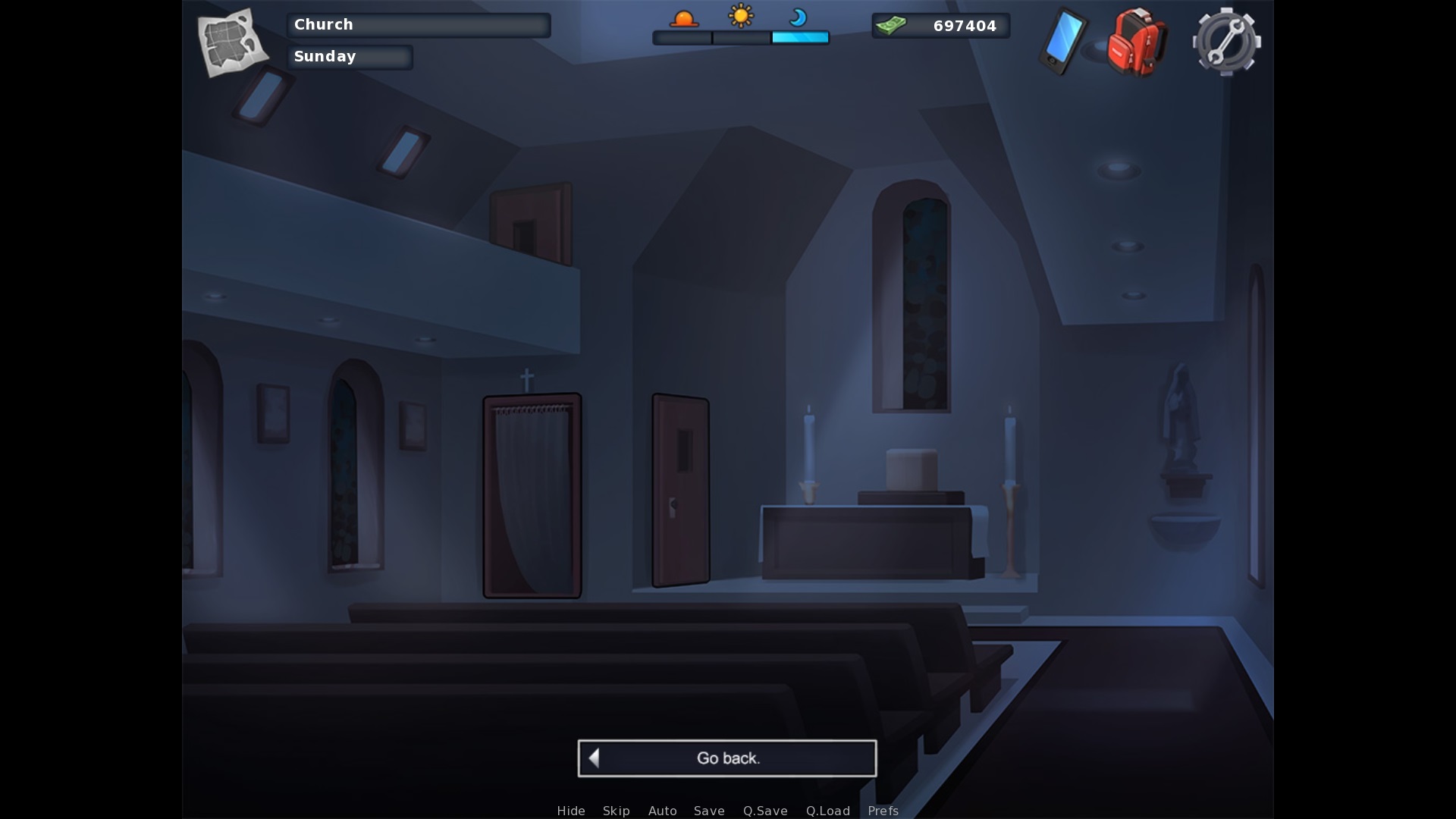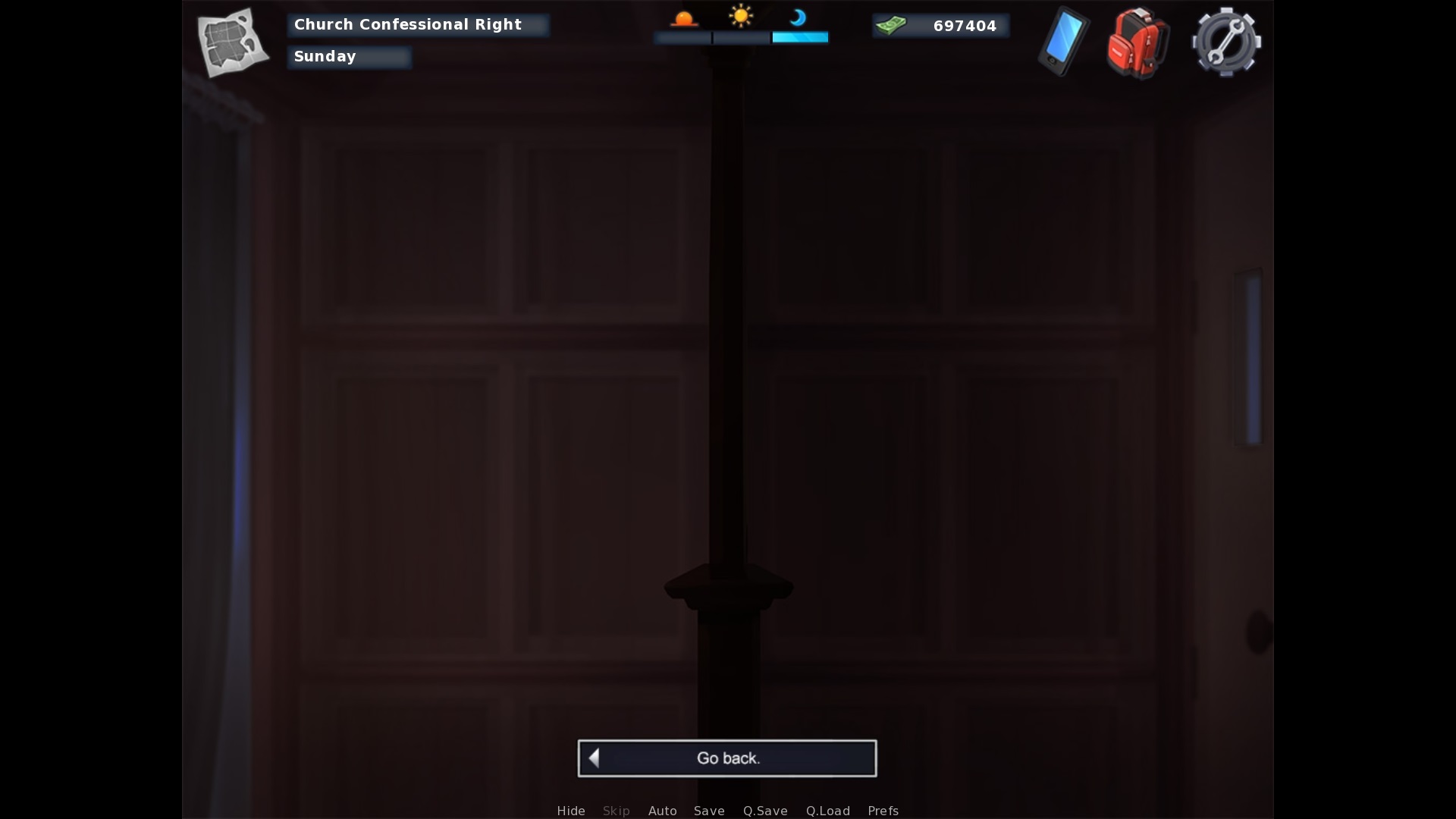 | Description | When you got into the confessional, whether it is the left or right one, turns the background into day before turning it into night again when the MC is done speaking. | ||||