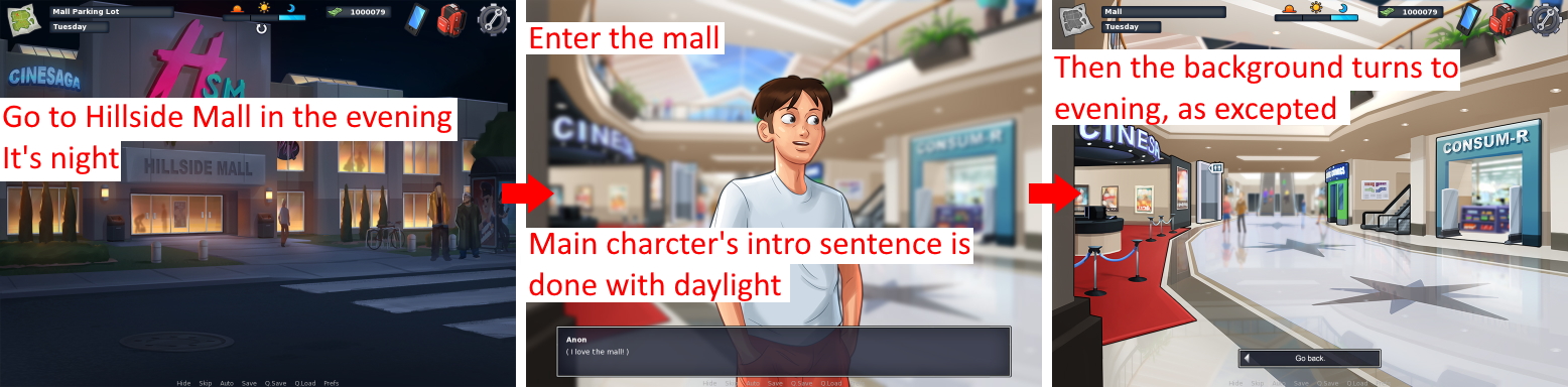 DescriptionWhen the main charcter first visits Hillside Mall during the evening, the background appears in daylight when it should be in night.