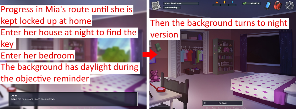| Description | ## Steps to reproduce 1. Progress in Mia's route until her mother lock her up at home. 2. Wait until you received a phone message from Mia at late night. 3. Enter Mia's house at night. 4. Enter Mia's bedroom at night. ## Issue * Mia's bedroom appears in daylight during the objective reminder. ## Solution * Mia's bedroom should appear in night (evening?) version during the objective reminder. Illustration & Save added below. | ||||