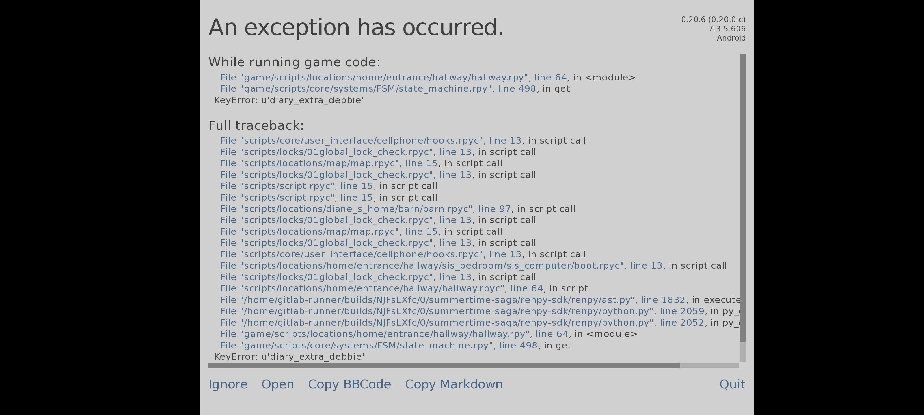 | Description | Everytime i encounter Debbie or the mc house i get a error screen and closes my game sometimes | ||||