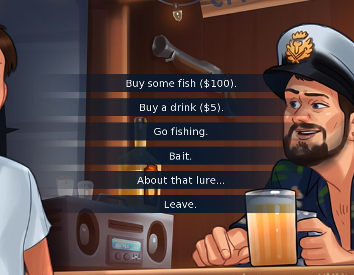 | Description | I have arrived at the right point in the Roxxy storyline where you buy drinks, asked erik and was told about Cpt Terry but when I go to the pier and click on Cpt Terry I only have the following options: buys some fish, buy a drink, go fishing, bait, about that lure... and leave. I've reproduced this on my Andorid version of the game as well and tried the option several times, at different times of the day and after advancing other story lines and on many different days. Running 0.20.7 | ||||