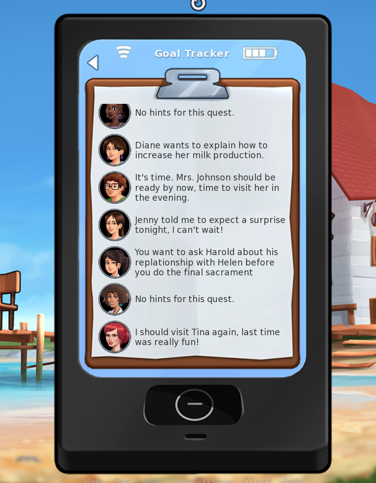 | Description | It seems that the questlines for Debbie, Captain Terry, Dewitt and Ross never give the player a hint to indicate what the player is expected to do. In this instance, the player has recently finished the talent show with dewitt, Debbie has viewed her second movie with the player, and the player just finished painting Miss Smith. These are all close to the end of the quest lines, but throughout the same "No hints for this Quest at this Time" message is displayed. I report this because I do not believe this is intended behavior, however I acknowledge that this had been happening for at least the last 2-3 updates. |