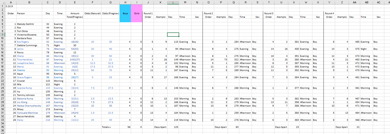 56 pregnancies, 4 per partner. 56 Boys. |