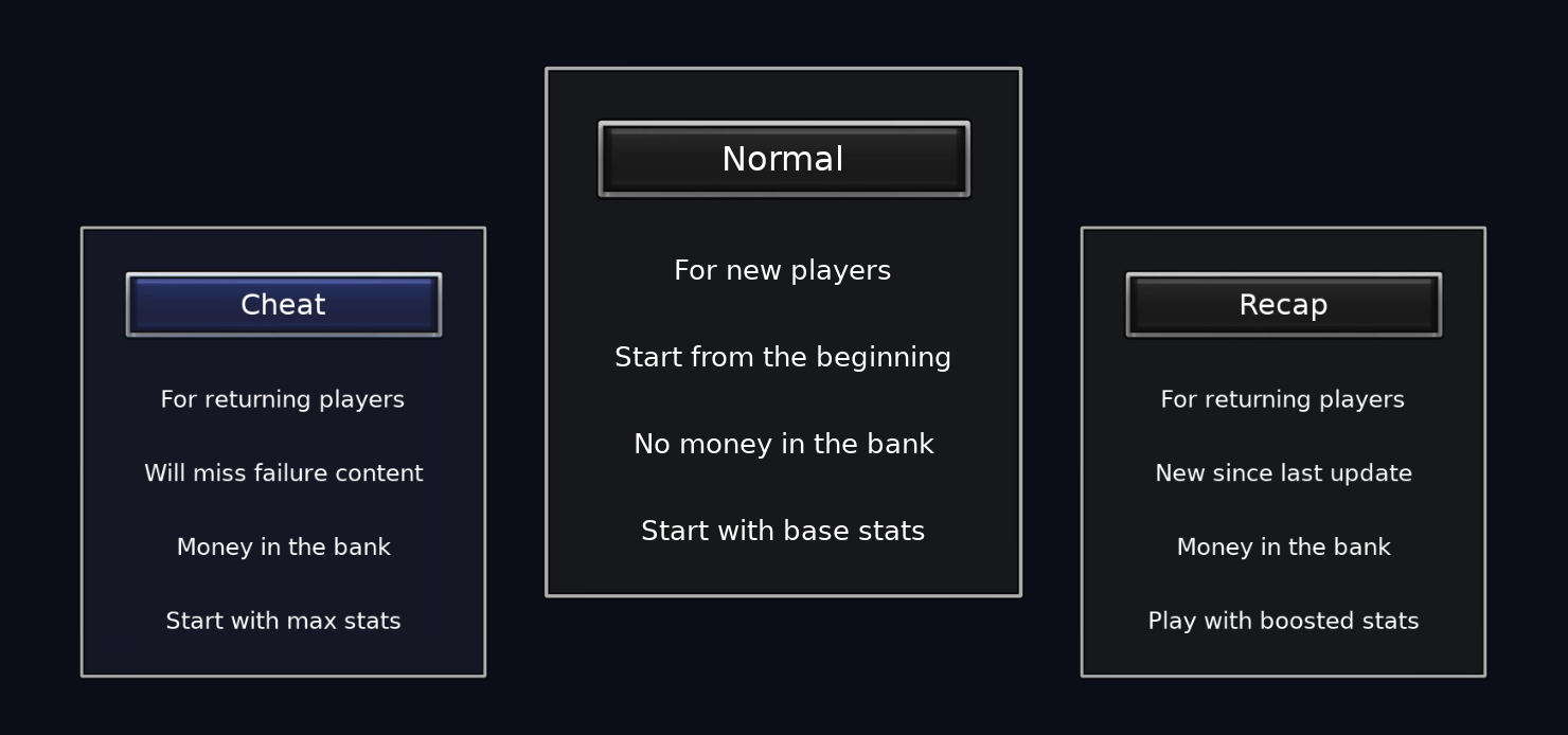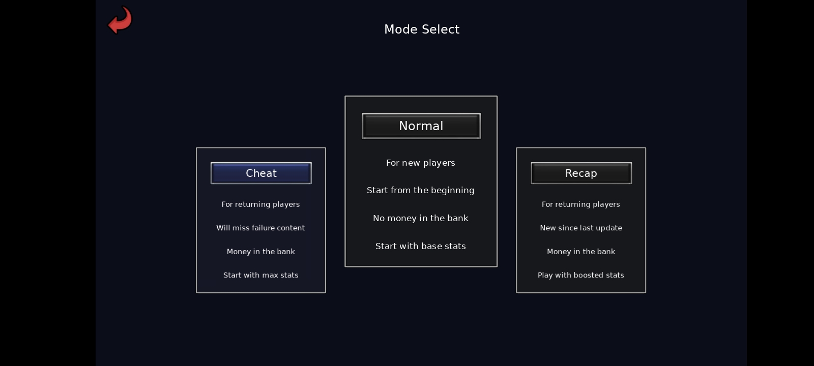 | Cheat mode is currently the only option available as the mini games to raise stats and earn money are unavailable, and so story progression would not be possible in normal play mode. This option will return once it's possible to earn money and stats via mini games once again. | |