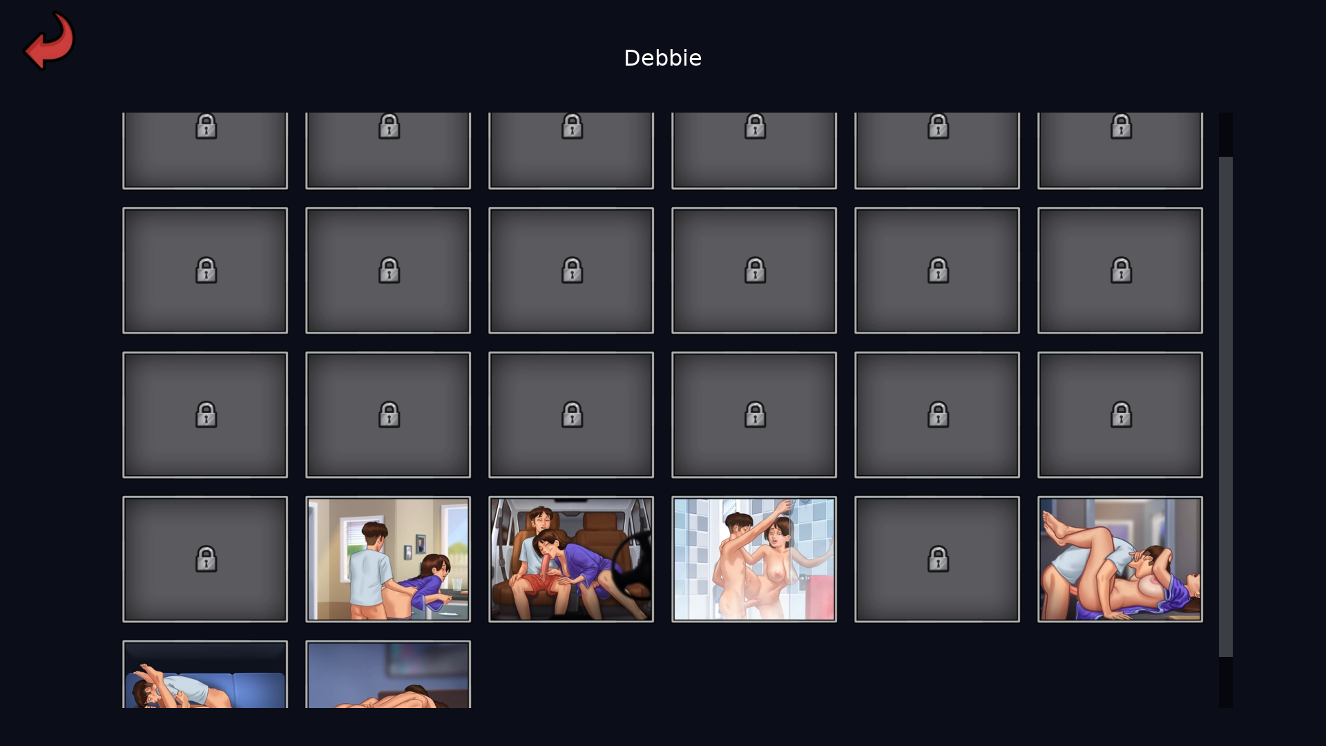 Omnikuken: The difference is that the Jenny variants, and the scene with Roxxy can be acquired with the original save, while the same cannot be said for all the Debbie scenes. WarXan97: Omnikuken has already covered most of the bases here, but I'll reiterate for clarity and confirmation: The Jenny scene that you don't have unlocked is part of Miss Bissette's route, which you can unlock by playing normally. Unfortunately your options for unlocking the Debbie scenes are to either: - Replay her route in a new game to trigger the various scene unlocks legitimately, or - Unlock the cheat menu (tap the wifi icon on the phone 7 times). Be aware, however, that the cheat menu will unlock all scenes only while the cheat is enabled, so if your goal is to carry this data into future previews replaying/skipping though Debbie's route on a separate save file you don't intend to keep is probably the better option. |