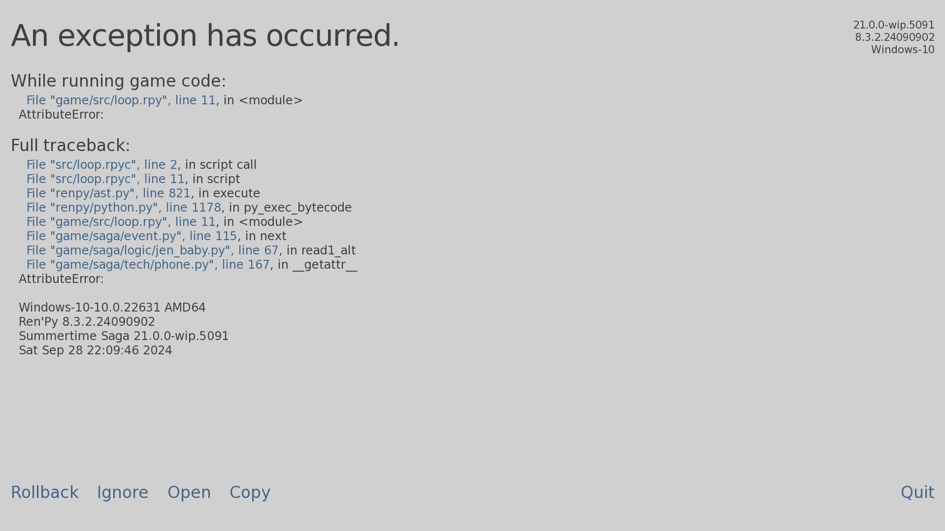 | Description | When I try to open my email, I get an error message and can't leave the room because I can't proceed to the next scene. 21.0.0 wip.5091 | ||||