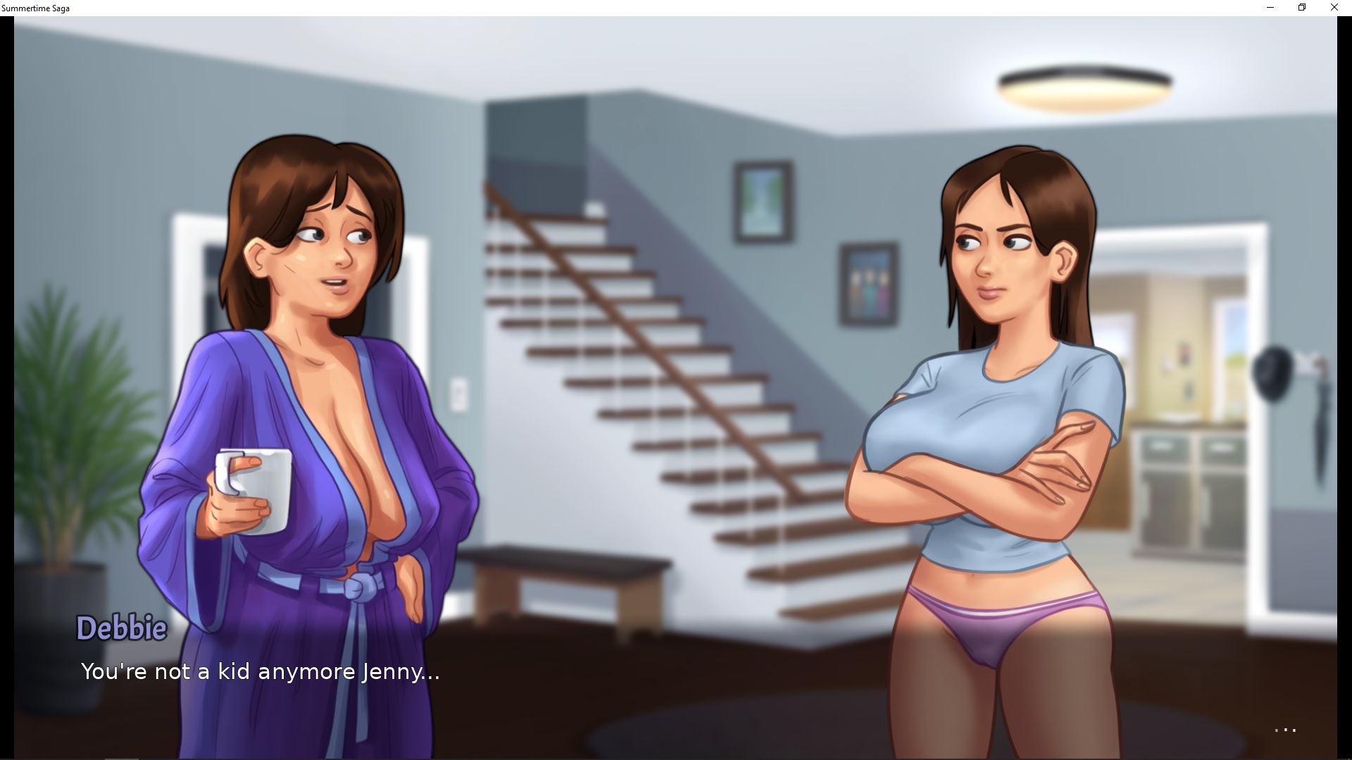 | Description | Here's a few places where her old art is still used : - After the lawnmower event, took a shower, went downstairs, Debbie and Jenny are arguing (nothing done in Jenny's route). Pic 1 - Had a special breakfast with Jenny (really early in her route still), went outside the house, Tammy is there talking with Debbie. Pic 2 | ||||