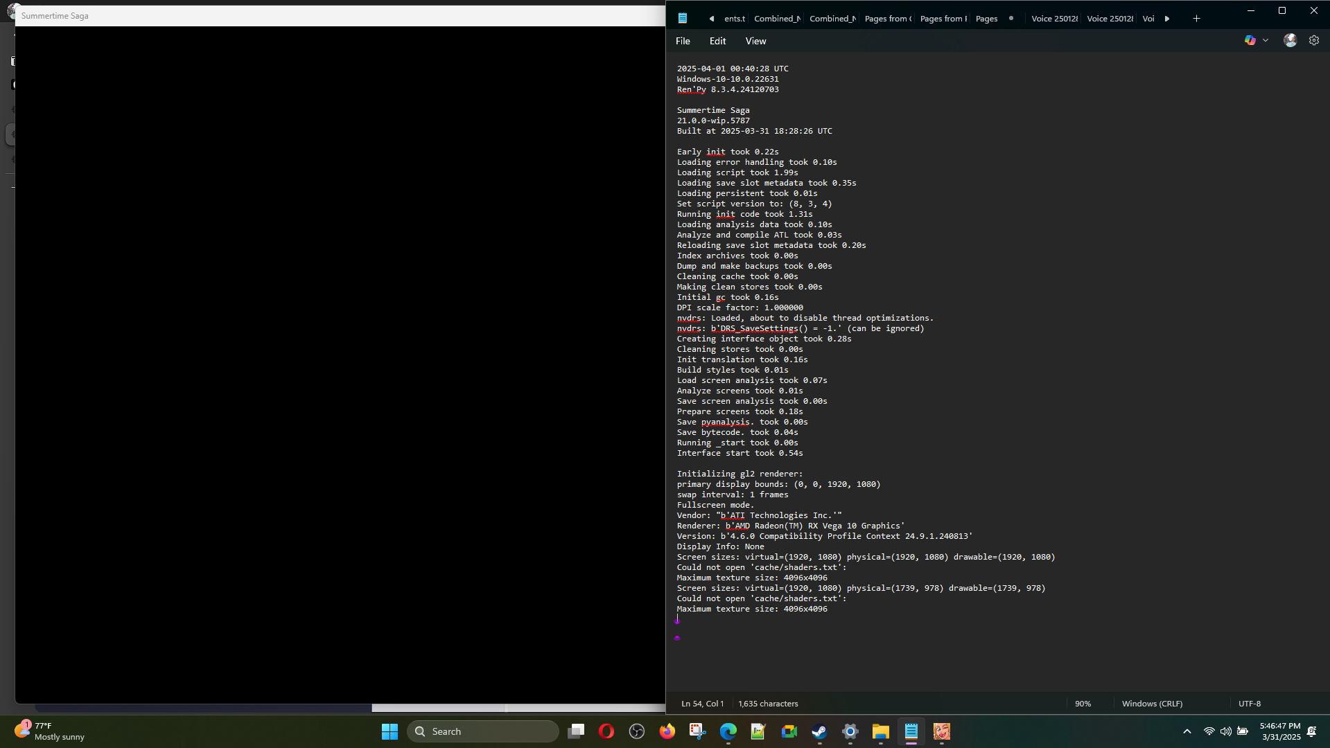2025-04-01 00:54:03 UTC Windows-10-10.0.22631 Ren'Py 8.3.4.24120703 Summertime Saga 21.0.0-wip.5787 Built at 2025-03-31 18:28:26 UTC Early init took 0.17s Loading error handling took 0.07s Loading script took 1.28s Loading save slot metadata took 0.03s Loading persistent took 0.11s Set script version to: (8, 3, 4) Running init code took 1.24s Loading analysis data took 0.11s Analyze and compile ATL took 0.03s Reloading save slot metadata took 0.02s Index archives took 0.00s Dump and make backups took 0.00s Cleaning cache took 0.00s Making clean stores took 0.00s Initial gc took 0.16s DPI scale factor: 1.000000 nvdrs: Loaded, about to disable thread optimizations. nvdrs: b'DRS_SaveSettings() = -1.' (can be ignored) Creating interface object took 0.29s Cleaning stores took 0.00s Init translation took 0.21s Build styles took 0.01s Load screen analysis took 0.06s Analyze screens took 0.01s Save screen analysis took 0.00s Prepare screens took 0.24s Save pyanalysis. took 0.00s Save bytecode. took 0.05s Running _start took 0.01s Interface start took 0.81s Initializing gl2 renderer: primary display bounds: (0, 0, 1920, 1080) swap interval: 1 frames Windowed mode. Vendor: "b'ATI Technologies Inc.'" Renderer: b'AMD Radeon(TM) RX Vega 10 Graphics' Version: b'4.6.0 Compatibility Profile Context 24.9.1.240813' Display Info: None Screen sizes: virtual=(1920, 1080) physical=(1739, 978) drawable=(1739, 978) Could not open 'cache/shaders.txt': Maximum texture size: 4096x4096 |