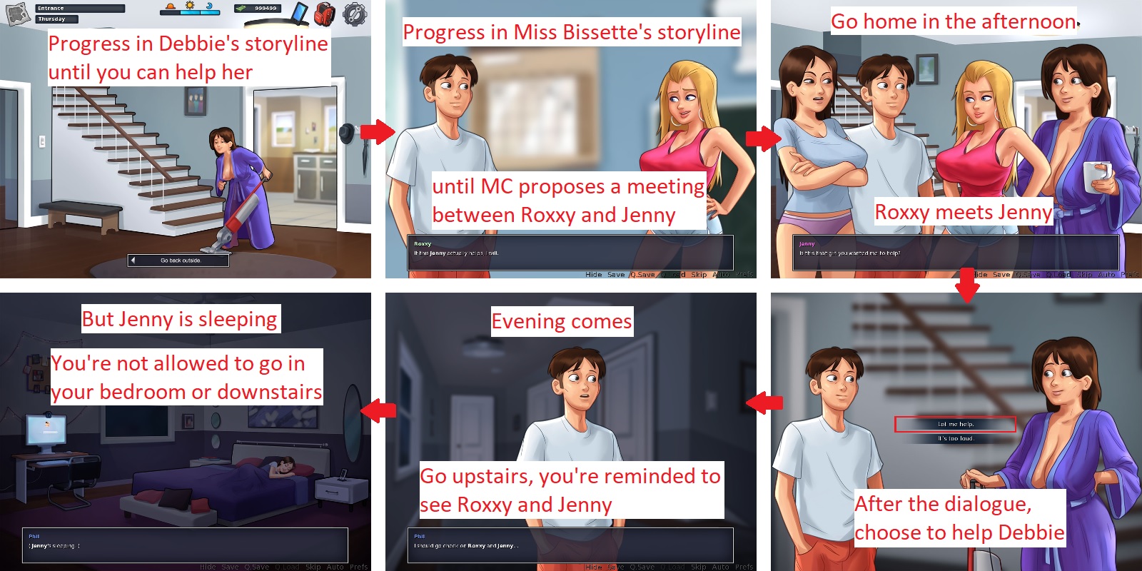 | Description | I was on day 30 and had the visit from Roxxy where Jenny is going to help her with the routine. Got the promt then to help Debbie with the cleaning. It then was night, I snuck into Jenny's bed, tried to cuddle, got kicked out. After that I was out of energy, and when I try leaving the hall I get the prompt telling me I need to check up on Roxxy and Jenny, while if I click on her room it says it's too late and I'm too tired | ||||