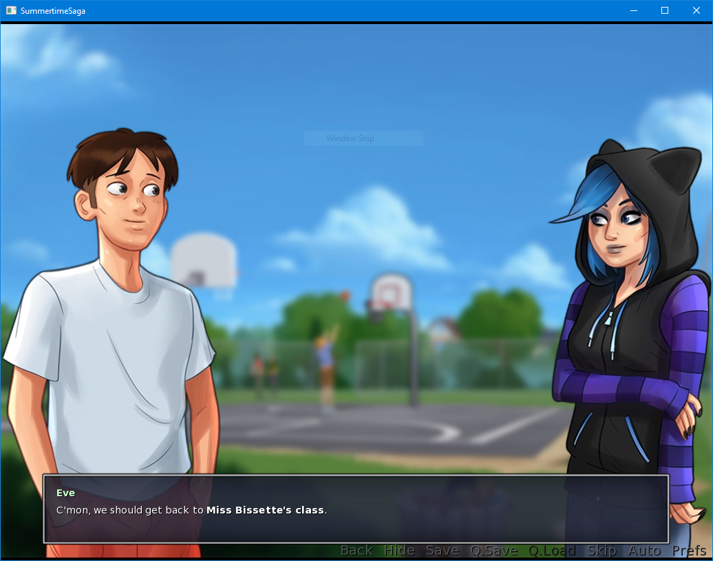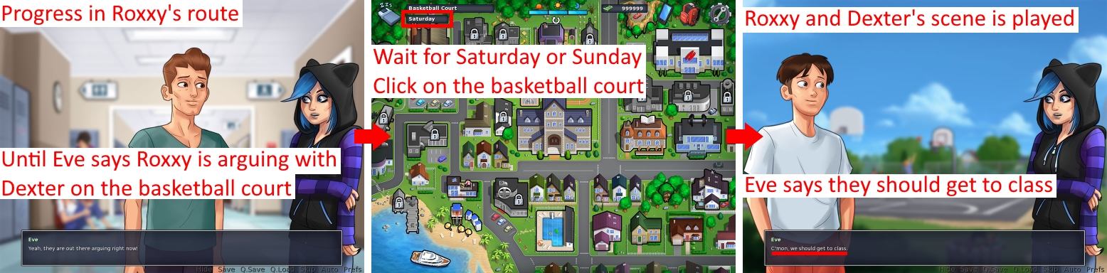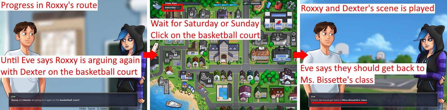 Still in version 0.18.6. As for the bug noticed in bug report 0000587, this bug occurs in two different events during Roxxy's route: - on the first argument between Roxxy and Dexter at the basketball court (Eve says "they should get to class.") - on the second argument between Roxxy and Dexter at the basketball court (Eve says "they should get back to Ms. Bissette's class.") But both events can be postponed until Saturday or Sunday, during which the school is closed. I think the solution I proposed in bug report 0000587 is the best: after the initial dialogue with Eve, the player should be moved directly to the basketball court, because these two scenes are intended to be played one after the other without delay. Get to class on weekend.jpg (531,506 bytes) Get to Ms. Bissette's class on weekend.jpg (531,195 bytes) |