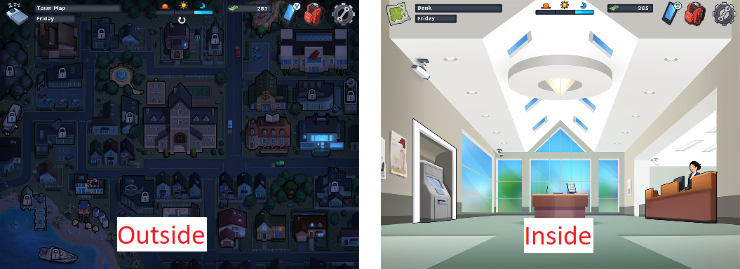 | Description | Visiting the bank at night will show you the daytime version of the bank. Probably needs to be disabled at night time for the time being. | ||||