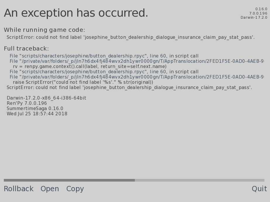 | Description | Can't make an insurance claim with Josephine without the game crashing. Impossible to continue Debbie's storyline because of this. [code] I'm sorry, but an uncaught exception occurred. While running game code: ScriptError: could not find label 'josephine_button_dealership_dialogue_insurance_claim_pay_stat_pass'. -- Full Traceback ------------------------------------------------------------ Full traceback: File "scripts/characters/josephine/button_dealership.rpyc", line 60, in script call File "/private/var/folders/_p/jln7h6dx4fj484wvx2dh1ywr0000gn/T/AppTranslocation/2FED1F5E-0AD0-4AEB-90AE-143BA145F323/d/SummertimeSaga.app/Contents/Resources/autorun/renpy/ast.py", line 1384, in execute rv = renpy.game.context().call(label, return_site=self.next.name) File "scripts/characters/josephine/button_dealership.rpyc", line 60, in script call File "/private/var/folders/_p/jln7h6dx4fj484wvx2dh1ywr0000gn/T/AppTranslocation/2FED1F5E-0AD0-4AEB-90AE-143BA145F323/d/SummertimeSaga.app/Contents/Resources/autorun/renpy/script.py", line 873, in lookup raise ScriptError("could not find label '%s'." % str(original)) ScriptError: could not find label 'josephine_button_dealership_dialogue_insurance_claim_pay_stat_pass'. Darwin-17.2.0-x86_64-i386-64bit Ren'Py 7.0.0.196 SummertimeSaga 0.16.0 Wed Jul 25 18:52:53 2018 [/code] | ||||