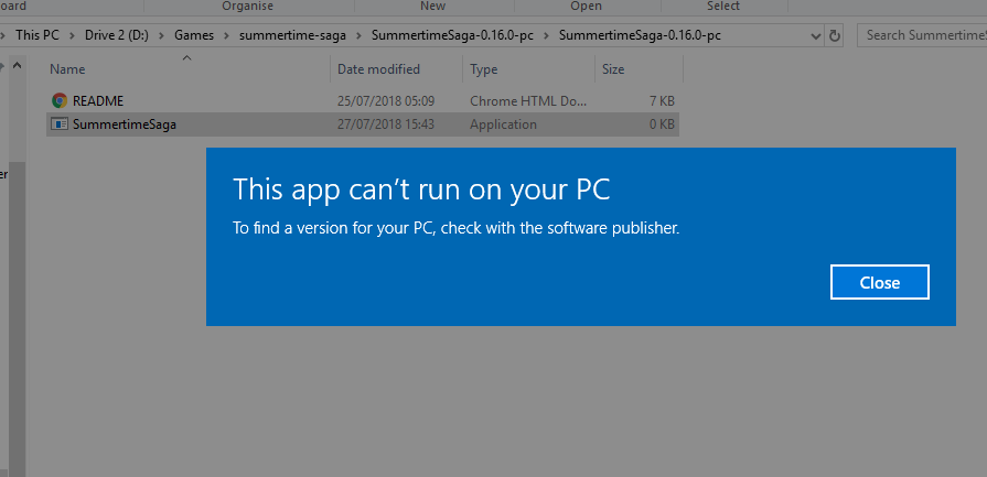 | Description | Just Downloaded version 0.16 and the application will not start up. every time I double click on the game a message pops up saying "This app can't run on your PC. To find a version for your PC, check with the software publisher". Do I need to download another program to play the game? | ||||
