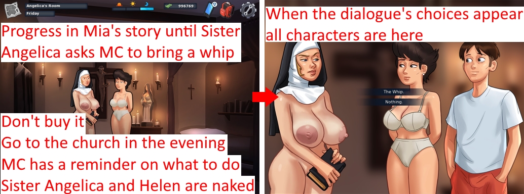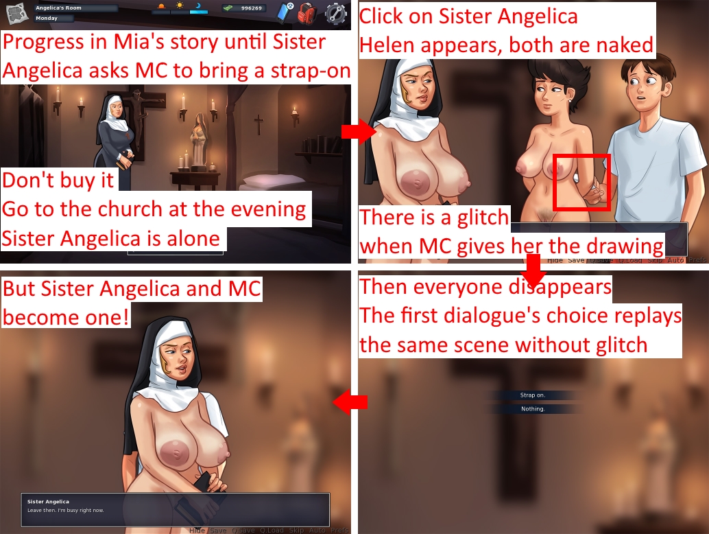 I'm able to reproduce this bug in version 0.17.5. See attachment. There are posing issues and glitch, and the behaviour is weird. Steps to reproduce: 1. Progress in Mia's story until Sister Angelica asks MC to bring her a strap-on. 2. Don't buy it. 3. Go to the church during the evening. Issues: • Sister Angelica is alone and she's dressed. • But if we click on her, Helen appears and both are naked. • There is a glitch when MC gives the drawing to Sister Angelica (it's not a photograph whatever the dialogue says btw). • At the end of the dialogue, everyone dispappears. • If we click on the first dialogue's choice, the previous scene replays. • But Sister Angelica and MC become one for the posing. Solution: • Completely redo this part? • As a comparison, I've also added the part where Sister Angelica asks MC to bring a whip. This part is fluent and without bug. It's a good start to take it and adapt it to the strap-on part. Glitch with strap-on.jpg (538,960 bytes) Whip.jpg (331,135 bytes) |