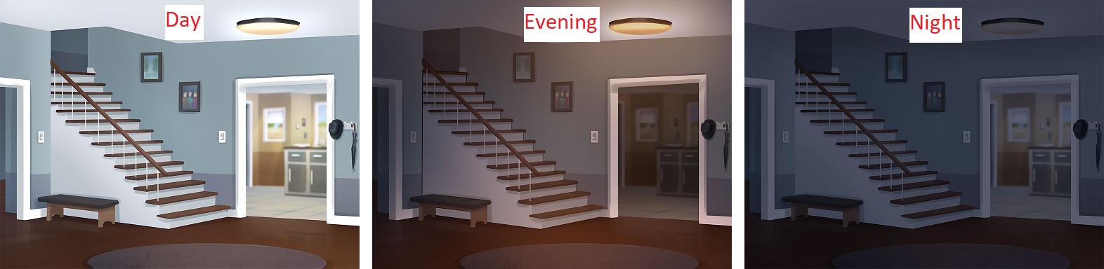 | In version 0.17.0, the stairs have now an evening version, the kitchen entrance still use a night version for evening, but that doesn't really matter. | |