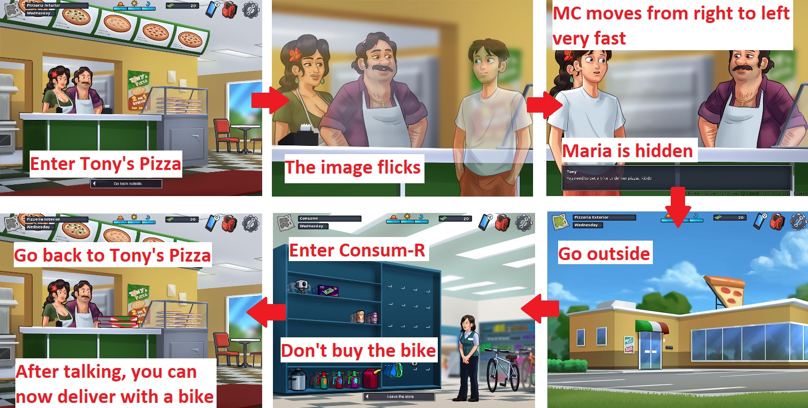 - First the image flickers very fast when you talk to Tony and if you don't have a bike. Maria is also hidden by MC. Solution: MC should stay on the right side of the image.