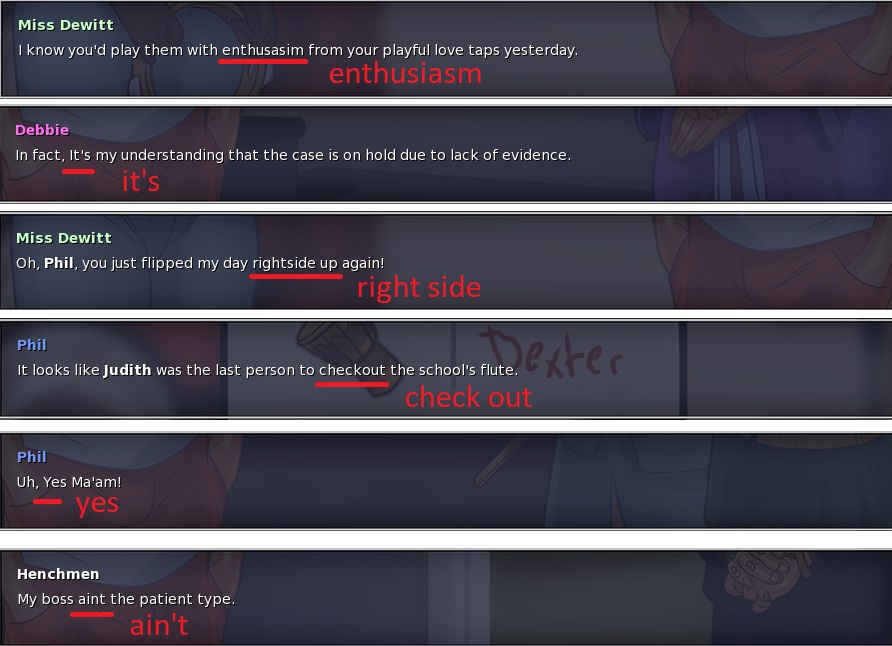 | Description | See the attachment for full dialogs where the typos are. enthusasim -> enthusiasm It's -> it's rightside -> right side checkout -> check out (it's a verb not a noun) Yes -> yes aint -> ain't I think some proofreading in SummerTime Saga would not be useless. :) | ||||