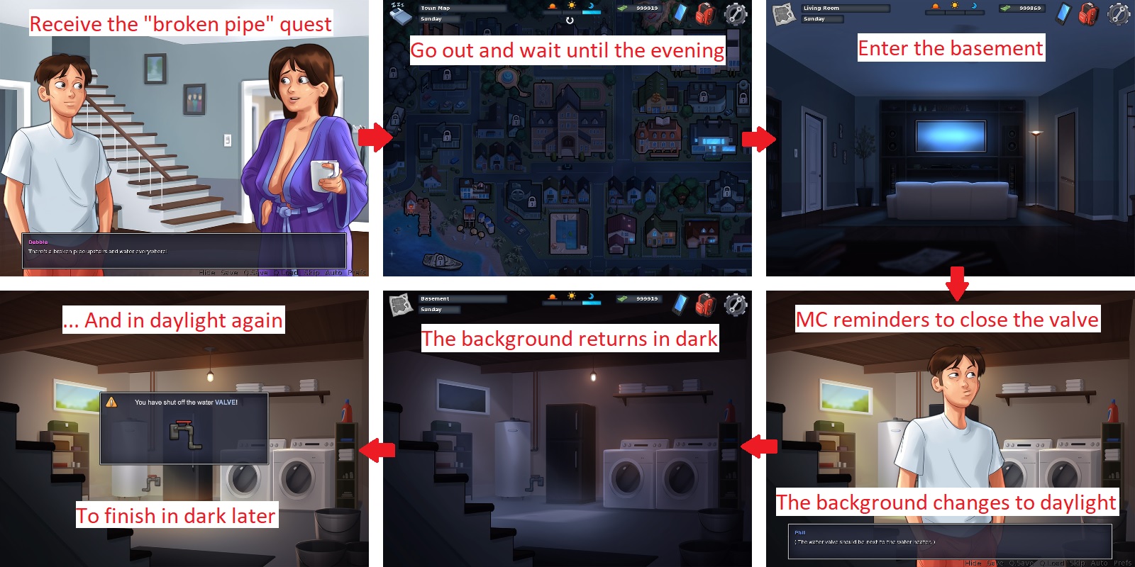 | Description | Version 0.16.1. See attachment. As SummerTime Saga becomes bigger, many players have difficulties to follow all the quests inside the game. You can have up to 12 quests at the same time. One way to answer this problem is to help them to stay on track. I offer one suggestion with the "Broken Pipe" quest, but it could be applied to others. At each step during this quest, MC is able to go outside. It encourages the players to begin new quests, before finishing the last one. And it has no interest because this quest: 1- ... doesn't require any money or any tool in the first steps. 2- ... doesn't require any stat. 3- ... doesn't have a specific timer (date or day time). 4- ... doesn't add time to the day. 5- ... could be considered as an urgent case, the bathroom being flooded. Solution: when the quest begins, the outside door and the map should be locked (with a message) until the need of the wrench. | ||||