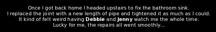 Note that Debbie says there is water everywhere, but if MC enters the bathroom during the evening/night, then the location isn't flooded. I add an illustration on how the day-night cycle is messed up badly in this event. It will surely be fixed when Jenny's storyline will use the fsm. Daycycle.jpg (365,407 bytes) |